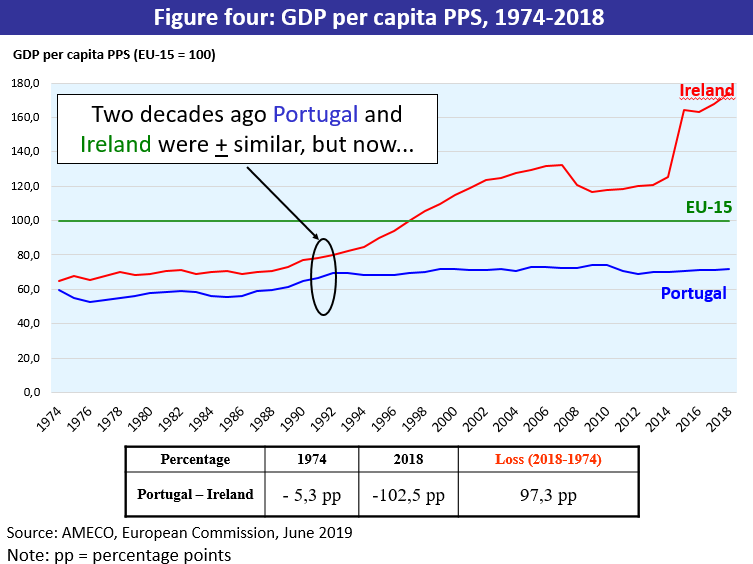 Ireland is the only previously poor country (when it joined the European Union) that has achieved fast convergence. It joined in 1973 with GDP per capita of 64,8%. In 1997, twenty-four years later its GDP per capita reached Europe’s average. In 2018 it is 74,2% above that average.