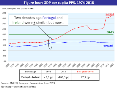 And if we compare just two countries? Portugal and Ireland, for instance? Well twenty-seven years ago both those countries had similar GDPs per capita. Then Ireland underwent a freedom revolution in the middle and late nineties. Portugal on the contrary passed from a ranking of 38th (in 1995) to 46th (in 2004) to 62nd (in 2019) in the economic freedom index. The result? Figure four speaks for itself: the GDP per capita of Ireland is now 243% that of Portugal.