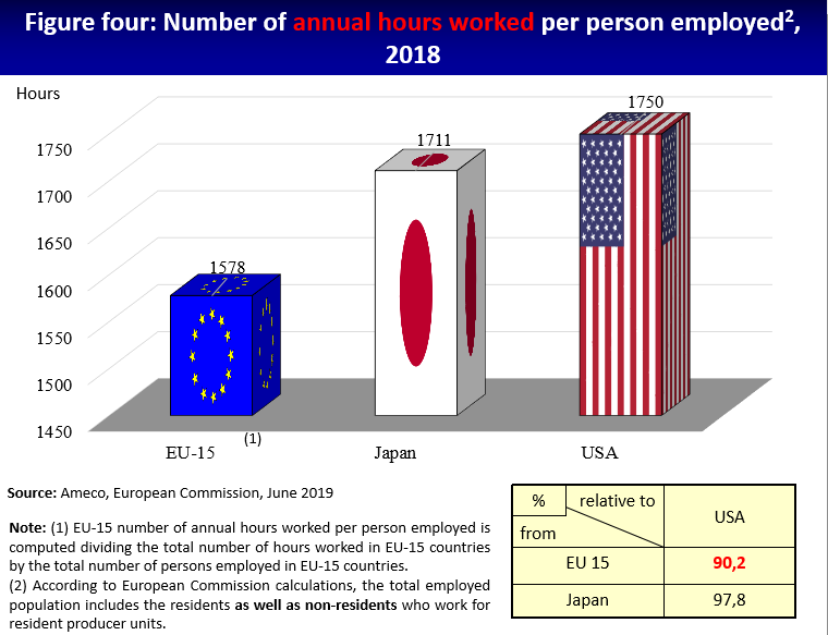 Then, not only do americans produce more per hour, but also they work longer hours (figure four): 1750 per year against 1578 in the EU, less 10% on average.