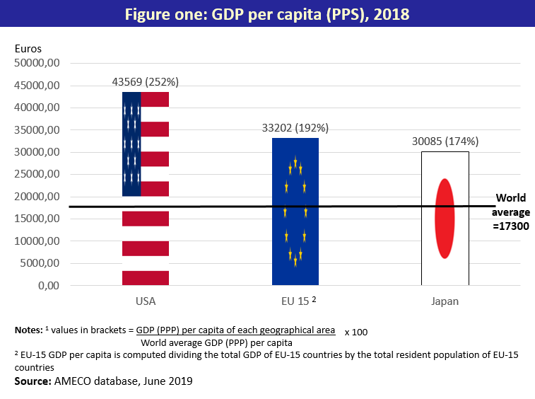 Figure one presents the Gross Domestic Product (GDP) per capita of the three major economic blocks: U.S.A.; E.U.; and Japan.